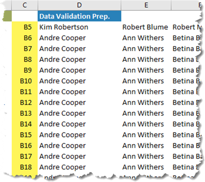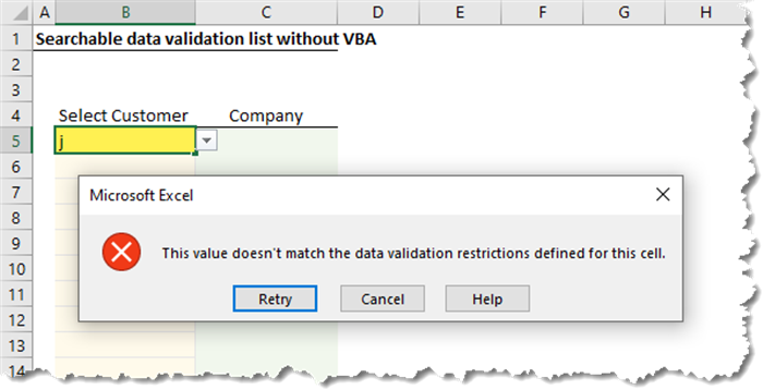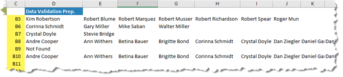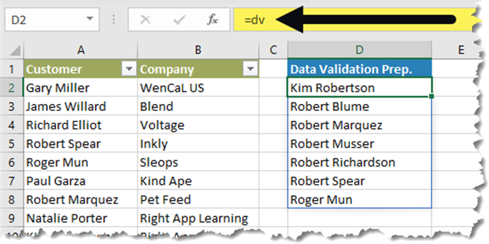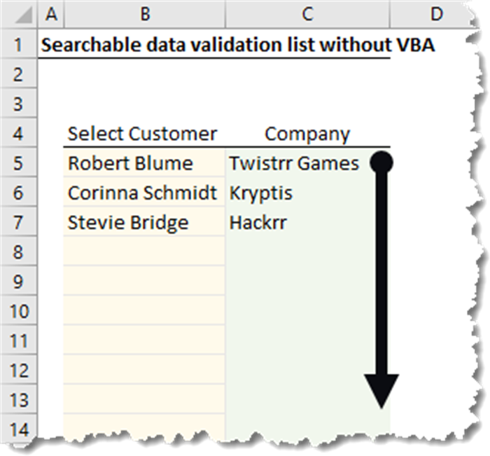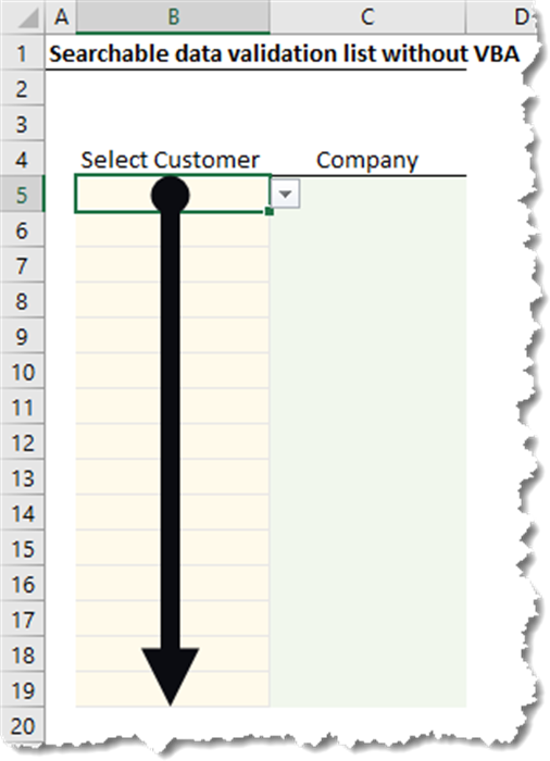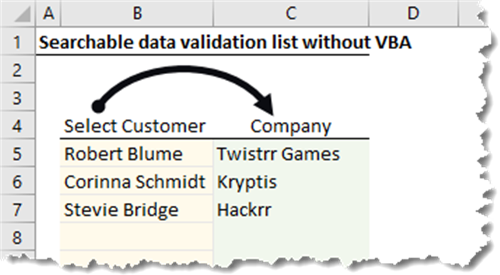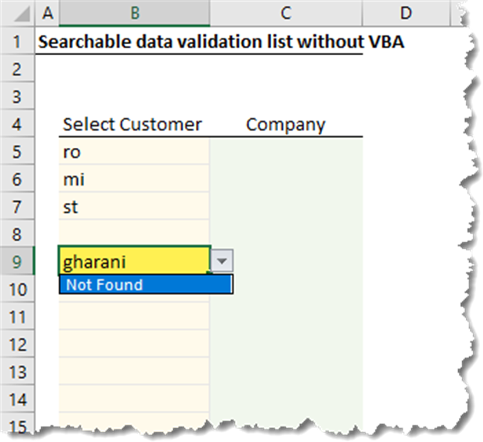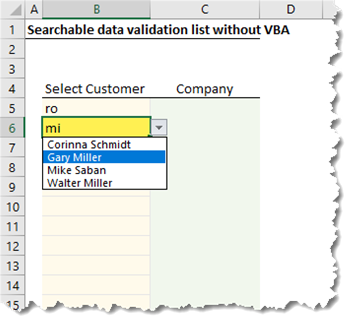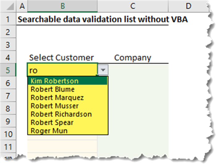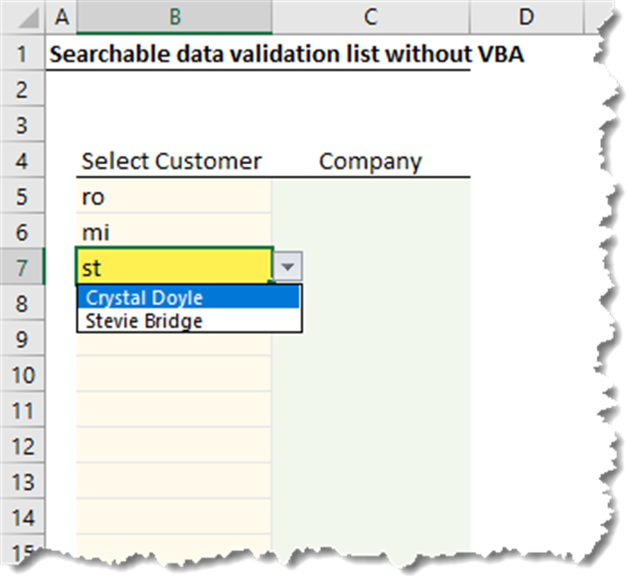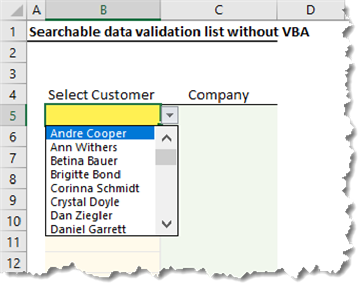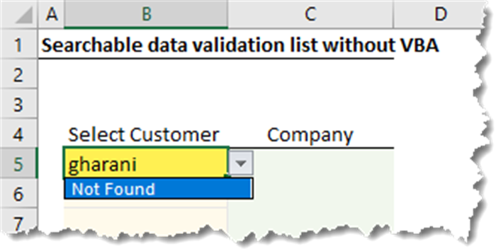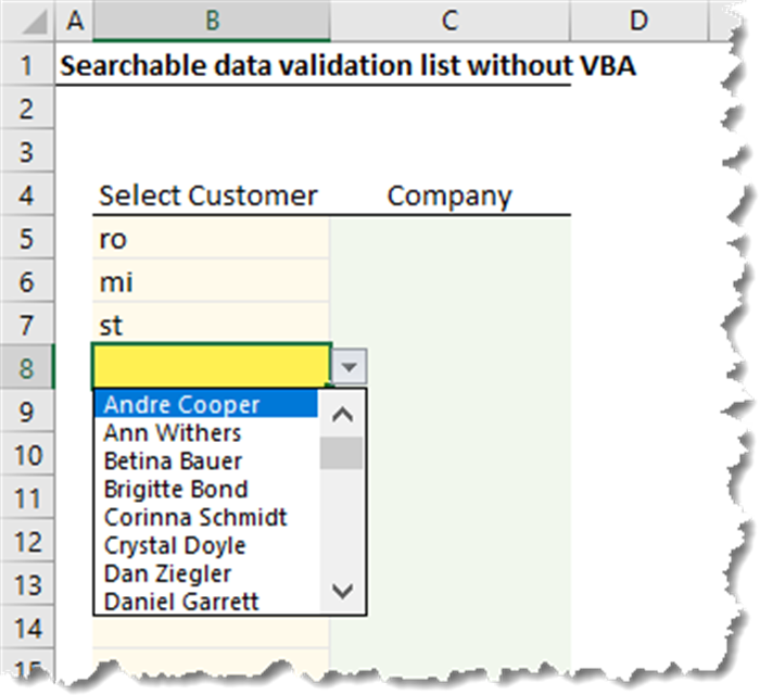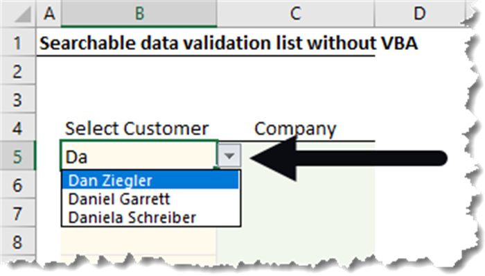 If we do not place any text in cell B5, the Data Validation list returns the entire list of customers.