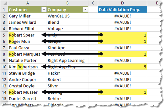 =SEARCH(Report!B5, TableCustomer[Customer])This returns a result for each item in the Customer column. If a Customer contains the desired text, we see the character position at which the text occurs. Otherwise, we see a #VALUE error.