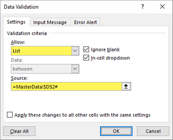 =MasterData!D2#NOTE: We are referencing cell D2 relatively, not absolutely. This is because we want the cell reference to change (i.e. D3, D4, D5, etc…) when we replicate Data Validation to the adjacent cells.