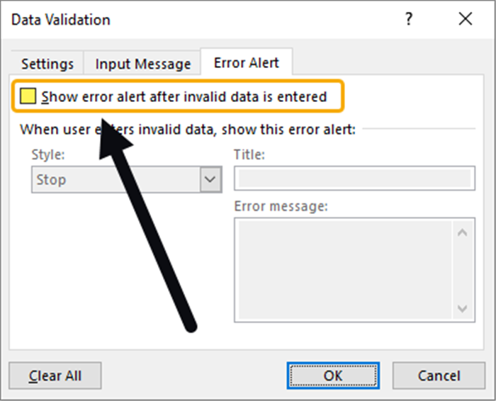 Return to the Data Validation dialog box and select the Error Alert tab. Clear the checkbox for “Show error alert after invalid data is entered”.