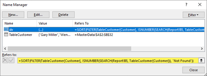 =FILTER(TableCustomer[Customer], ISNUMBER(SEARCH(Report!B5, TableCustomer[Customer])), “Not Found”)