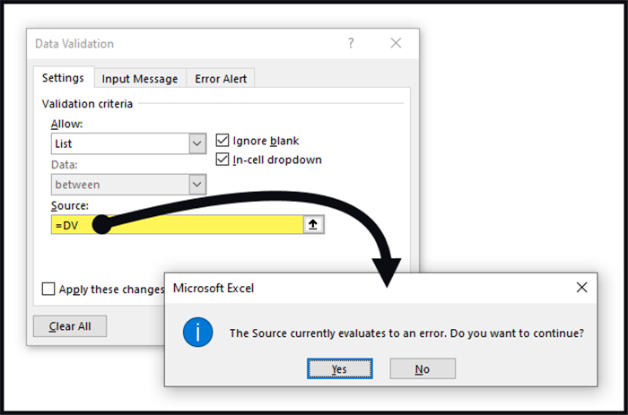Since the test reference to “DV” worked in a cell, let’s try it in Data Validation.