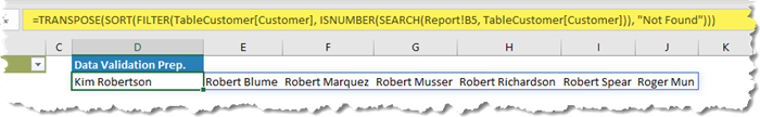 =TRANSPOSE(SORT(FILTER(TableCustomer[Customer], ISNUMBER(SEARCH(Report!B5, TableCustomer[Customer])), “Not Found”)))