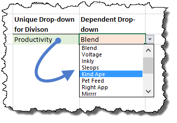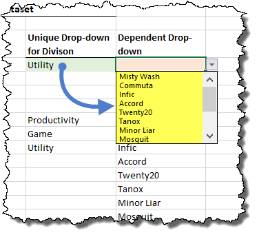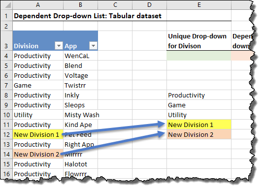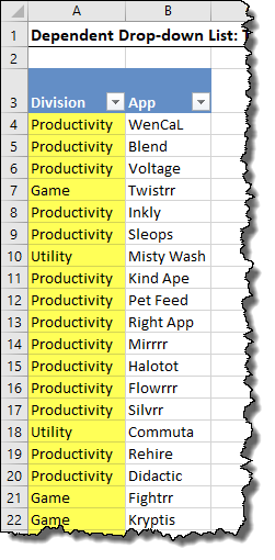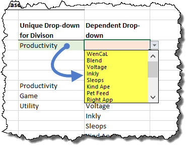 The data validation drop-down includes a unique list of Division names. A second unique list of Apps is created and associated with the Division dropdown list. When the user selects a Division, the App dropdown list changes to reflect only Apps related to the selected Division.
