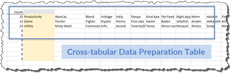 For these lists to interact with one another, a cross-tabular data preparation table was created that lists all the Divisions in row order and all the associated Apps in column order.