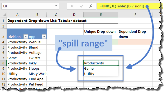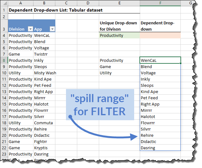 =FILTER(Table1[App],Table1[Division]=E4)This creates the requested “filtered” list of Apps based on the selected Division.