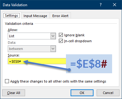 If we return to the Data Validation option for the Division dropdown, we don’t refer to the current list as the source (i.e. E8:E10); this is because the Division list may expand, and the dropdown would not display the additional Divisions. All we need to do is refer to the FIRST cell where we originally entered the Unique function.