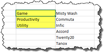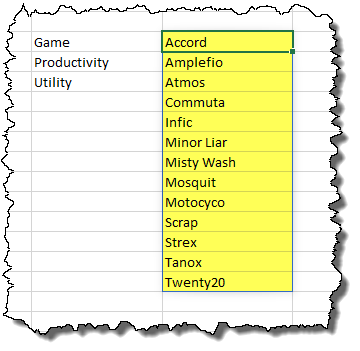 =OFFSET($F$7,MATCH($E$4,$E$8:$E$17,0),,1,COUNTIF(OFFSET($F$7,MATCH($E$4,$E$8:$E$17,0),,1,20),"?*"))When the formula compiles the App list, it is smart enough to stop at the last App and not include any empty cells which may be located at the bottom of the table.