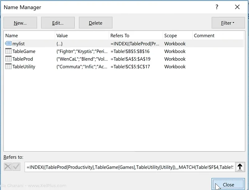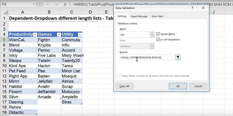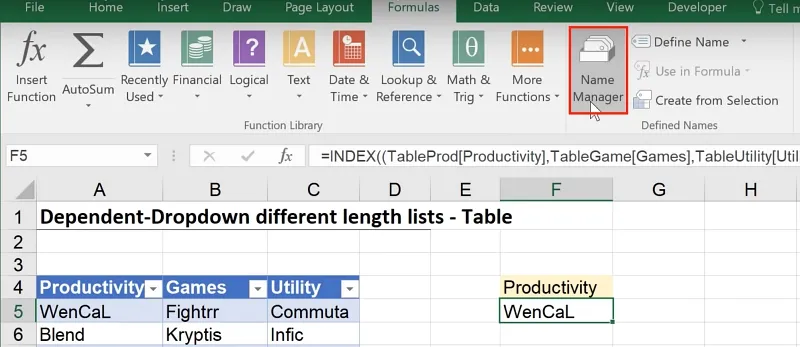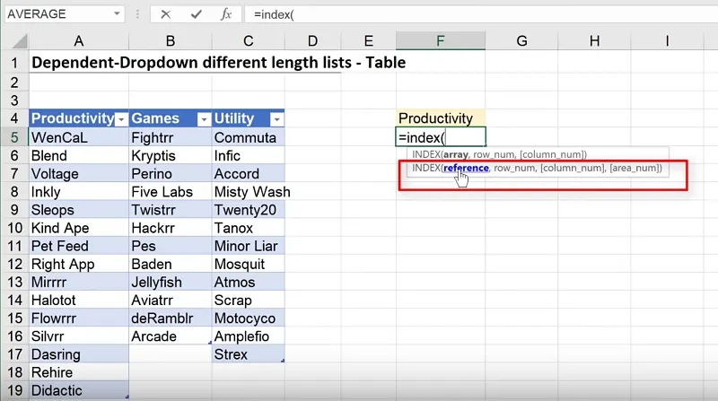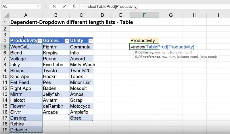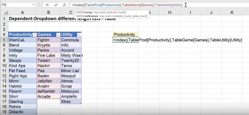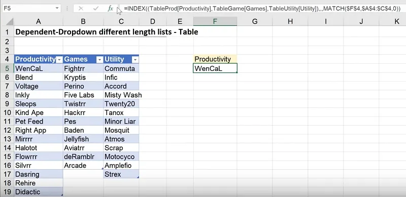 =INDEX((TableProd[Productivity],TableGame[Games],TableUtility[Utility]),,,MATCH($F$4,$A$4:$C$4,0))