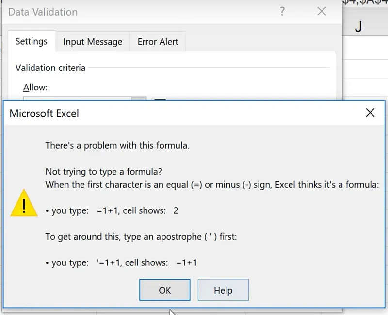 Whenever a formula is to be used as a data validation criteria, it is usually easier to first set the formula up on the spreadsheet, then transfer it to the data validation window so that all the Excel helper tips show up as guides.