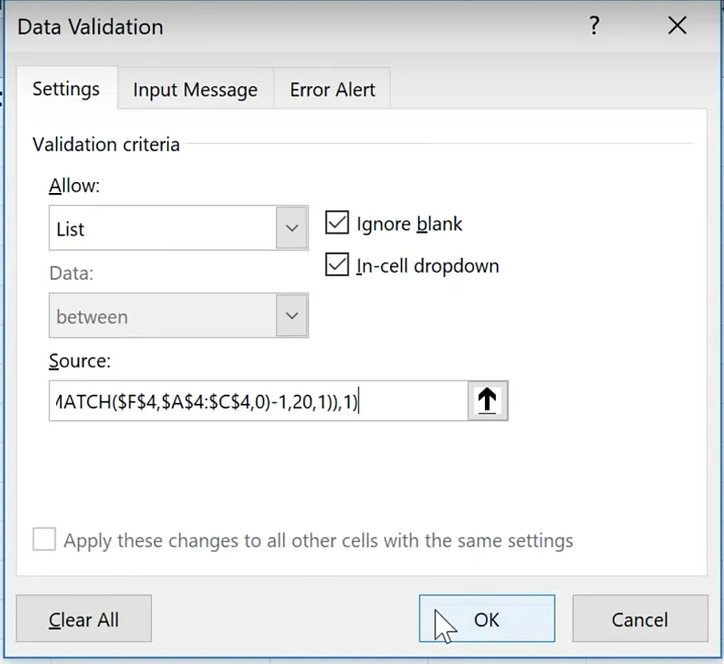 MATCH($F$4,$A$4:$C$4,0)-1- [height] = how many rows will be displayed. Use a bigger height than what is expected to make sure additional cells are taken account of. An arbitrary number 20 is used for this example, which should be sufficient. This value can be changed later on.