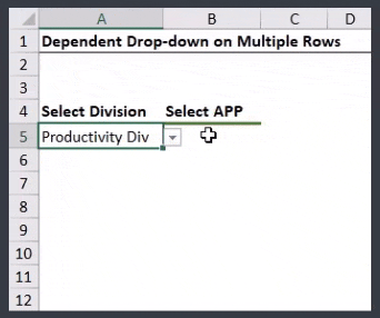 If we select a Division from the first drop down list (A5), we then see the list of related Apps in the second drop down list (B5).