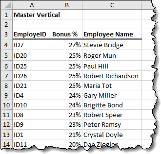 On a separate tab (named “B_Master”), we have a list of employee IDs, their bonus percentage, and the employee names.