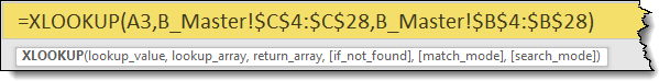 =XLOOKUP(A3, B_Master!$C$4:$C$28, B_Master!$B$4:$B$28)
