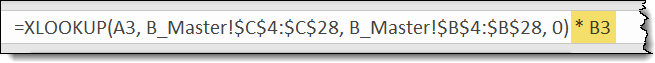 =XLOOKUP(A3, B_Master!$C$4:$C$28, B_Master!$B$4:$B$28, 0) * B3