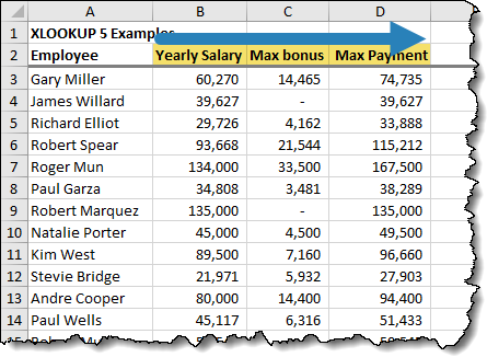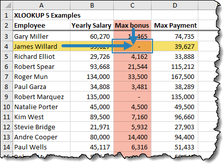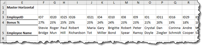 Let’s perform the same task are the previous example, calculating a bonus amount, but this time we will find the employee name on Row 5 and the percentage on Row 4 of the “B_Master” sheet.