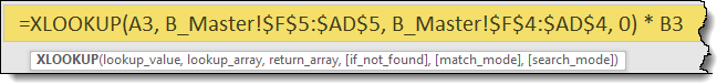 =XLOOKUP(A3, B_Master!$F$5:$AD$5, B_Master!$F$4:$AD$4, 0) * B3