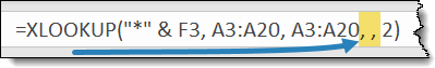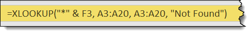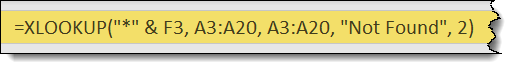 =XLOOKUP(“*” & F3, A3:A20, A3:A20, “Not Found”, 2)