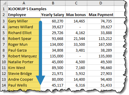 Because XLOOKUP defaults to “exact match” mode, we are using the “-1” option for the [match_mode] argument. If we fail to locate an exact match of the salary, we want to return the closest one that doesn’t exceed the salary.