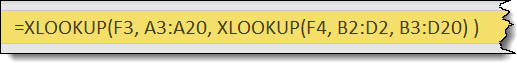 =XLOOKUP(F3, A3:A20, XLOOKUP(F4, B2:D2, B3:D20) )