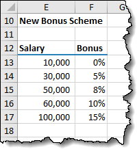 Anyone earning up to just under 30,000 does not receive a bonus. From 30,000 to just under 50,000, the employee earns a 5% bonus on their yearly salary. From 50,000 to just under 60,000 they receive an 8% bonus, and so on.