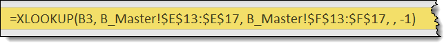 =XLOOKUP(B3, B_Master!$E$13:$E$17, B_Master!$F$13:$F$17, , -1)