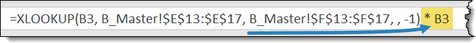 =XLOOKUP(B3, B_Master!$E$13:$E$17, $F$13:$F$17, , -1) * B3