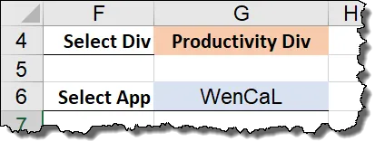 We will select “Productivity Div” from the first drop-down (cell G4) and “WenCal” from the second drop-down (cell G6).