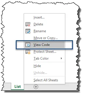First off, we need to open the Visual Basic Editor. This can be opened using the shortcut key Alt-F11. Because we are going to be placing the code on the “List” sheet, we will right-mouse-click on the “List” sheet tab and select View Code.
