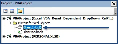 You need to ensure that you are placing the VBA event code inside the correct sheet. The sheet holding the drop-down lists is named “List”, so double-check that the “List” sheet is selected from the Project Explorer on the left side of the screen.