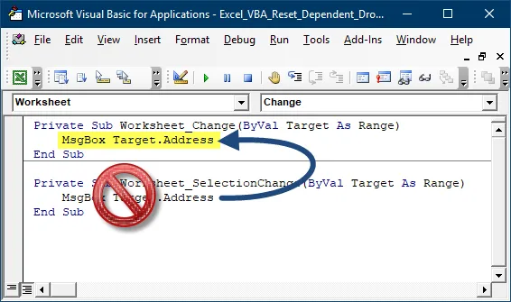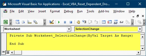 We could run the macro to reset the dependent drop-down list every time any cell is selected, but that would be undesirable. We only want the second list to reset when the value in the first list changes. An event better suited for this behavior is called the Change event.
