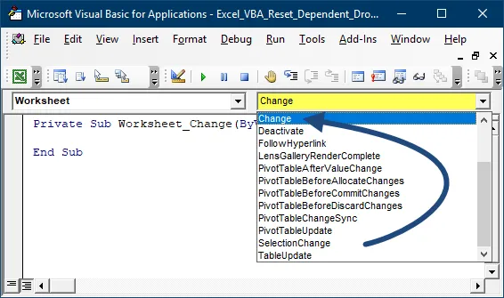 From the VBA Editor, select Change event from the drop-down.