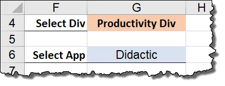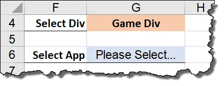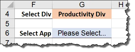 This will be very simple. We want to place the phrase, “Please Select…“, in cell G6 the moment we change the value of the first drop-down list (cell G4). This will ensure that the displayed items for Division and App are not inconsistent.