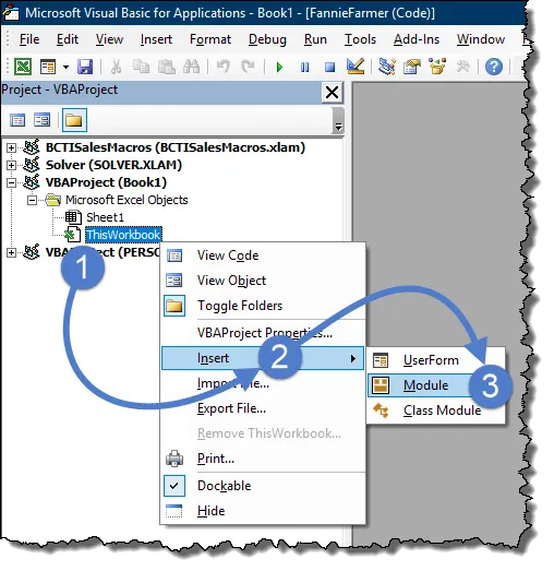 Right-click “This Workbook” in the Project Explorer (upper-left of VBA Editor) and select Insert ⇒ Module.