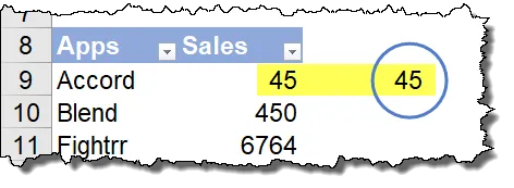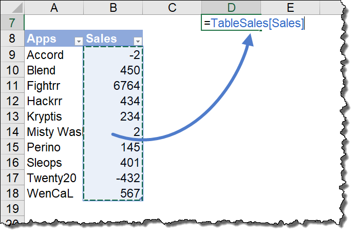 =Select cells B9:B18 and note the update to the formula. This contains the proper method for referring to table fields (columns).