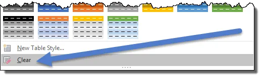 We want to restore our original cell colors. Select Table Tools ⇒ Design ⇒ Table Styles (group) ⇒ Expand the table styles list and select Clear (bottom of list).