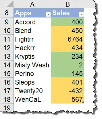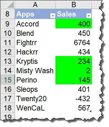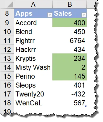 We want to color all the cells in range B9:B18 green if their cell value is between 1 and 400.