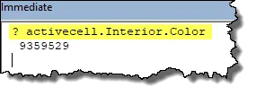 With the newly colored cell selected, click in the Immediate Window of the VBA Editor and enter the following text and press ENTER.