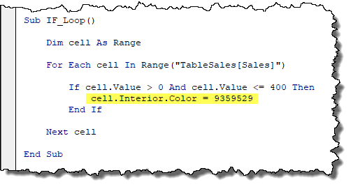 We want the cell color to change to green if the cell’s value is between 1 and 400. We can use the Interior object to set the Color property to green. Enter the following code in the VBA Editor.