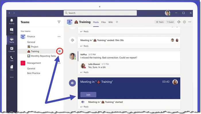 The other team members of the selected channel will see that a video chat has started and then can click the “Join” button to enter the meeting.