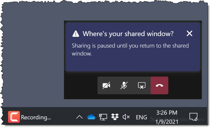 If you are sharing a single window, and you minimize that shared window, you will see a message in the lower-right informing you that your sharing session has been paused but will return upon restoration of the minimized window.