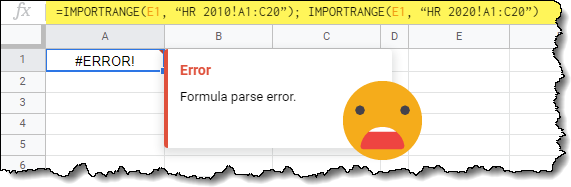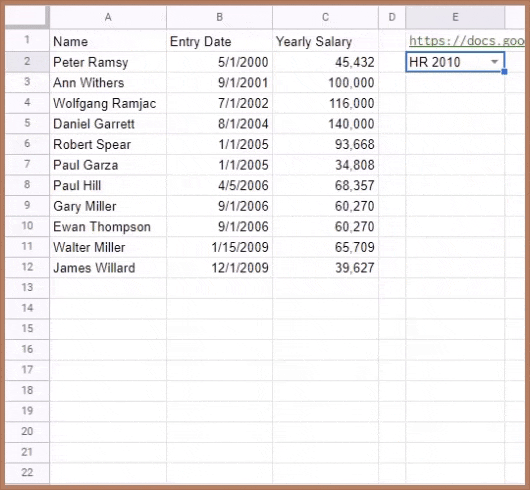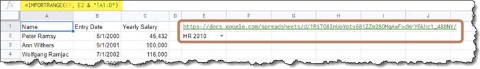 =IMPORTRANGE(E1, “HR 2010!A1:C20”); IMPORTRANGE(E1, “HR 2020!A1:C20”)