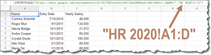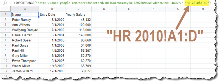 =IMPORTRANGE(“copied URL goes here”, “HR 2010!A:C”)