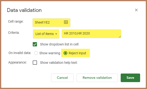 In the Data Validation dialog box, for the Criteria select “List of Items” and enter “HR 2010,HR2020” as the list items. We will also disallow the user from entering their information by selecting “Reject Input”.