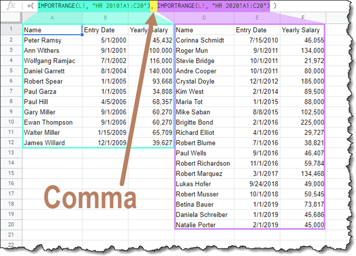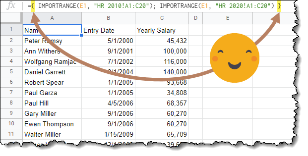 ={ IMPORTRANGE(E1, “HR 2010!A1:C20”); IMPORTRANGE(E1, “HR 2020!A1:C20”) }