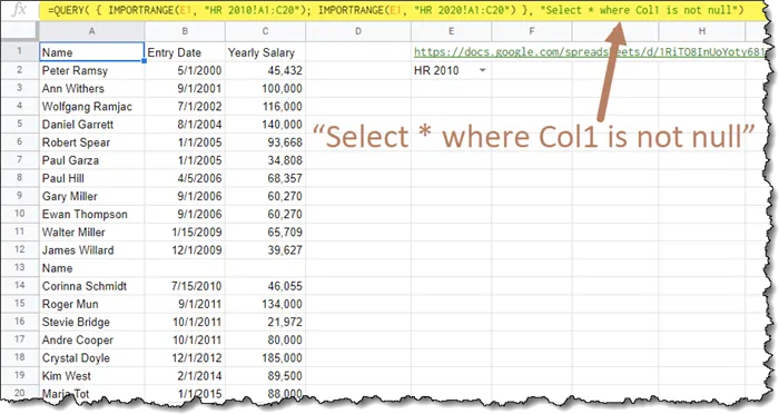 =QUERY{ IMPORTRANGE(E1, “HR 2010!A1:C20”); IMPORTRANGE(E1, “HR 2020!A1:C20”) },Next, we add the query logic.