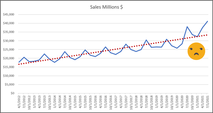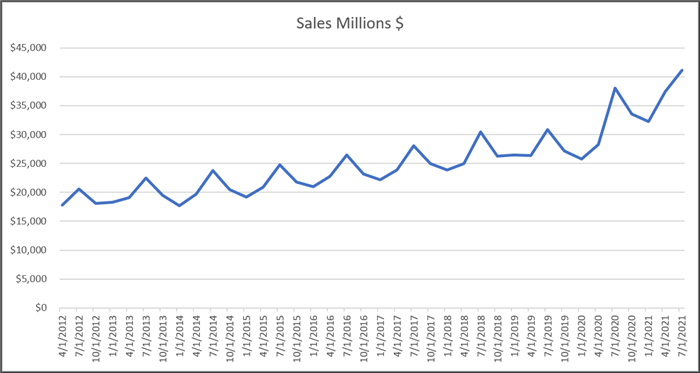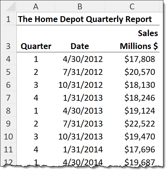 I’ll demonstrate Excel’s easy tool to create a future forecast. We’ll use it to make a sales forecast. For historic data, we’ll use the last ten years of quarterly sales for Home Depot.