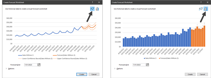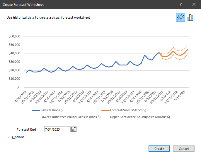 Clicking CREATE in the Create Forecasting Worksheet dialog box produces a new forecasting sheet with two objects: