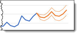 If your confidence level is set to 95% (the default setting in Excel), then you can expect that 95% of your future data points will fall within the upper and lower bounds shown.
