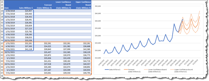 - Adjust the Details: The thick orange line (or bar) is your main forecast. The thinner lines around it are the confidence bounds, which tell us where future sales are likely to be 95% of the time.